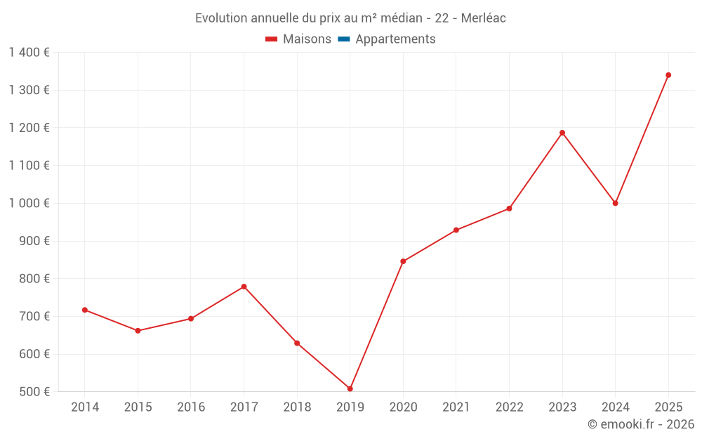Le prix médian sur les 19 transactions de maisons des 24 derniers mois dans la commune de Merléac était de 1 000 € par mètre carré pour une valeur foncière médiane de 105 000 €. Sur cette période 60% des transactions se sont situées entre 715 et 1 329 € par mètre carré (du 2ème au 8ème déciles).