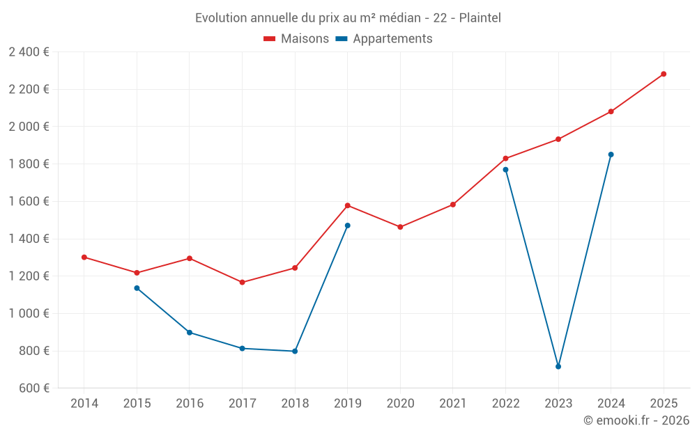 Le prix médian sur les 40 transactions de maisons des 12 derniers mois dans la commune de Plaintel était de 2 112 € par mètre carré pour une valeur foncière médiane de 175 888 €. Sur cette période 60% des transactions se sont situées entre 1 521 et 2 351 € par mètre carré (du 2ème au 8ème déciles).