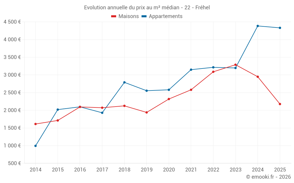 Le prix médian sur les 16 transactions d'appartements des 12 derniers mois dans la commune de Fréhel était de 4 377 € par mètre carré pour une valeur foncière médiane de 168 000 €. Sur cette période 60% des transactions se sont situées entre 3 839 et 4 667 € par mètre carré (du 2ème au 8ème déciles).