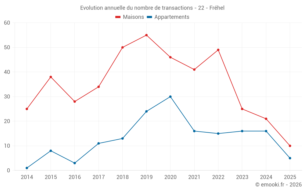 Le prix médian sur les 21 transactions de maisons des 12 derniers mois dans la commune de Fréhel était de 2 729 € par mètre carré pour une valeur foncière médiane de 260 000 €. Sur cette période 60% des transactions se sont situées entre 1 875 et 3 346 € par mètre carré (du 2ème au 8ème déciles).