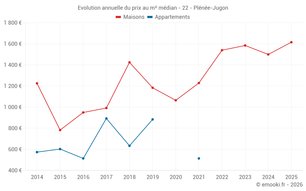 Le prix médian sur les 33 transactions de maisons des 12 derniers mois dans la commune de Plénée-Jugon était de 1 500 € par mètre carré pour une valeur foncière médiane de 148 000 €. Sur cette période 60% des transactions se sont situées entre 1 116 et 2 042 € par mètre carré (du 2ème au 8ème déciles).