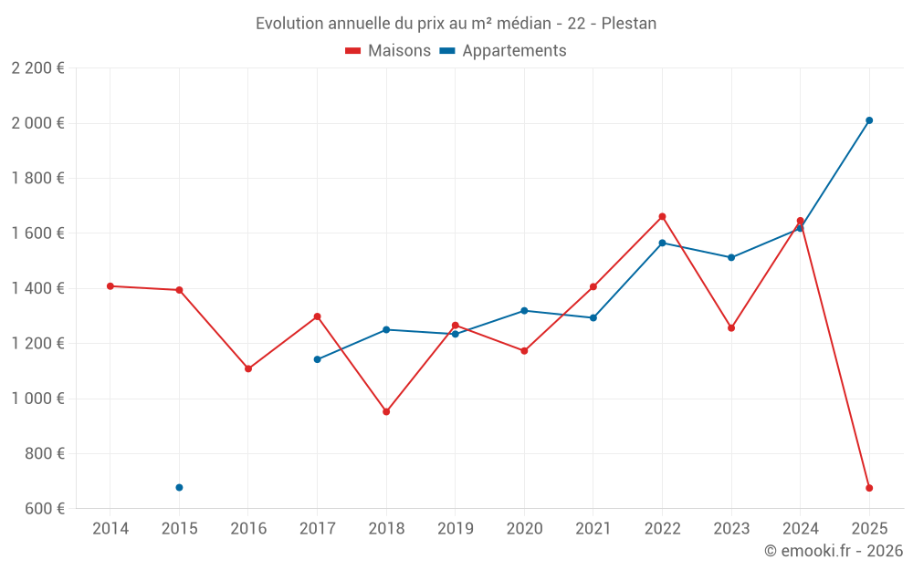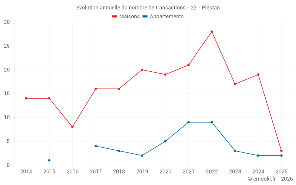 Le prix médian sur les 29 transactions de maisons des 24 derniers mois dans la commune de Plestan était de 1 313 € par mètre carré pour une valeur foncière médiane de 150 000 €. Sur cette période 60% des transactions se sont situées entre 1 052 et 1 881 € par mètre carré (du 2ème au 8ème déciles).