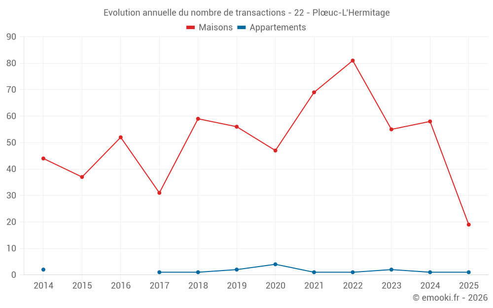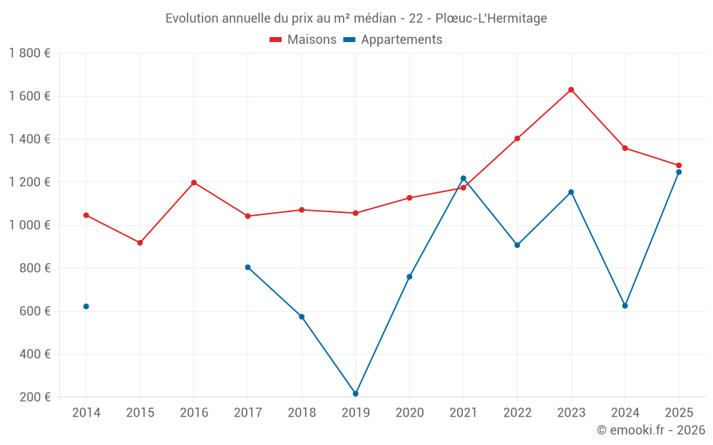 Le prix médian sur les 19 transactions de maisons des 6 derniers mois dans la commune de Plœuc-L'Hermitage était de 1 278 € par mètre carré pour une valeur foncière médiane de 145 000 €. Sur cette période 60% des transactions se sont situées entre 859 et 2 075 € par mètre carré (du 2ème au 8ème déciles).