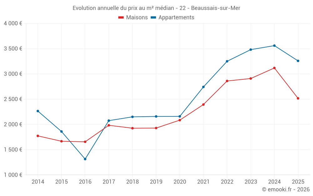Le prix médian sur les 17 transactions d'appartements des 24 derniers mois dans la commune de Beaussais-sur-Mer était de 3 529 € par mètre carré pour une valeur foncière médiane de 195 000 €. Sur cette période 60% des transactions se sont situées entre 3 325 et 3 809 € par mètre carré (du 2ème au 8ème déciles).