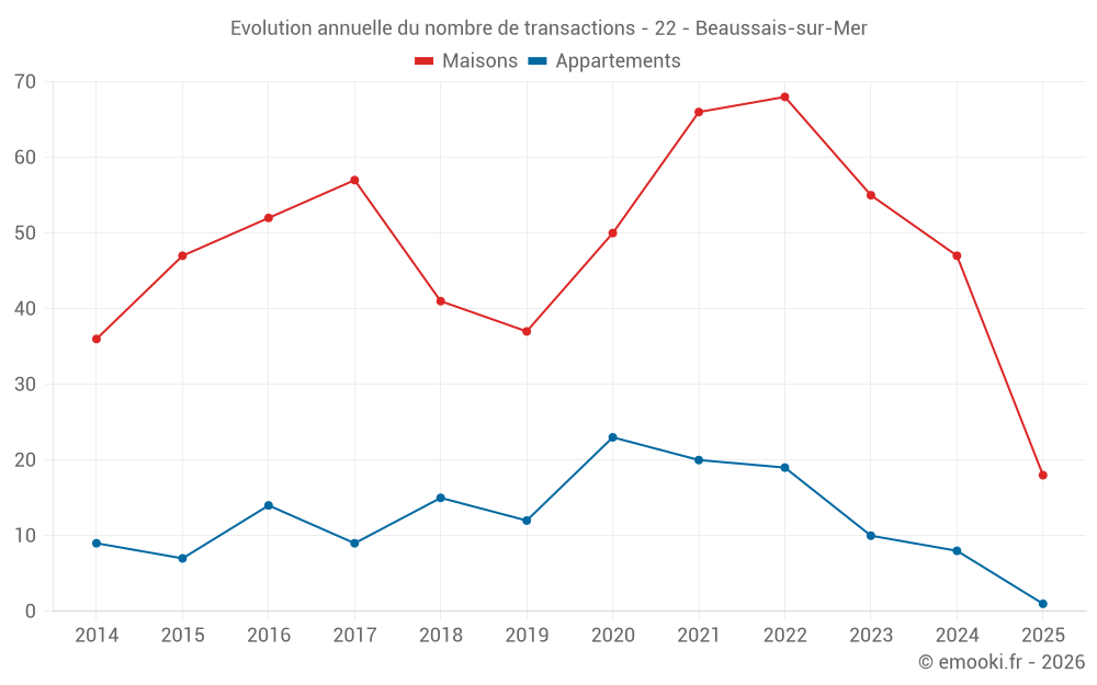 Le prix médian sur les 18 transactions de maisons des 6 derniers mois dans la commune de Beaussais-sur-Mer était de 2 516 € par mètre carré pour une valeur foncière médiane de 329 200 €. Sur cette période 60% des transactions se sont situées entre 2 117 et 3 684 € par mètre carré (du 2ème au 8ème déciles).
