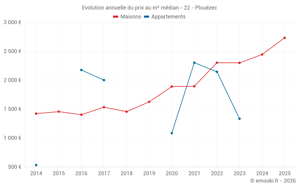 Le prix médian sur les 22 transactions de maisons des 6 derniers mois dans la commune de Plouézec était de 2 732 € par mètre carré pour une valeur foncière médiane de 212 500 €. Sur cette période 60% des transactions se sont situées entre 2 245 et 3 395 € par mètre carré (du 2ème au 8ème déciles).