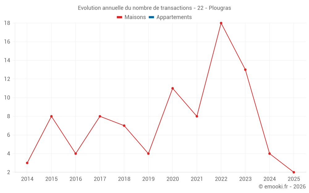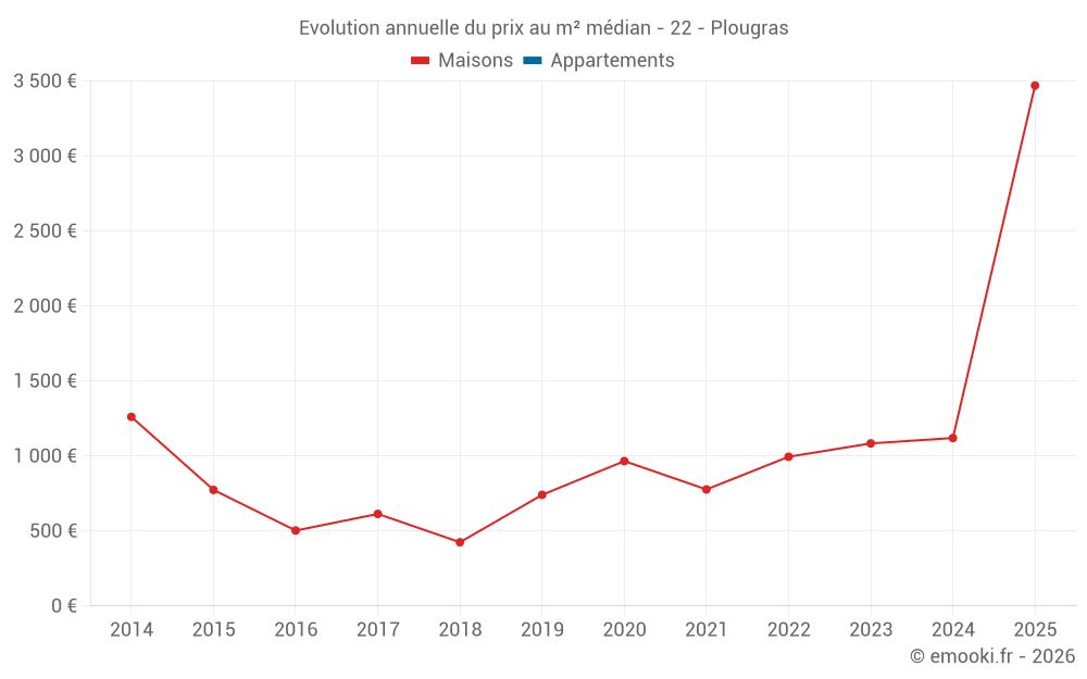 Le prix médian sur les 15 transactions de maisons des 24 derniers mois dans la commune de Plougras était de 1 250 € par mètre carré pour une valeur foncière médiane de 116 000 €. Sur cette période 60% des transactions se sont situées entre 755 et 2 418 € par mètre carré (du 2ème au 8ème déciles).