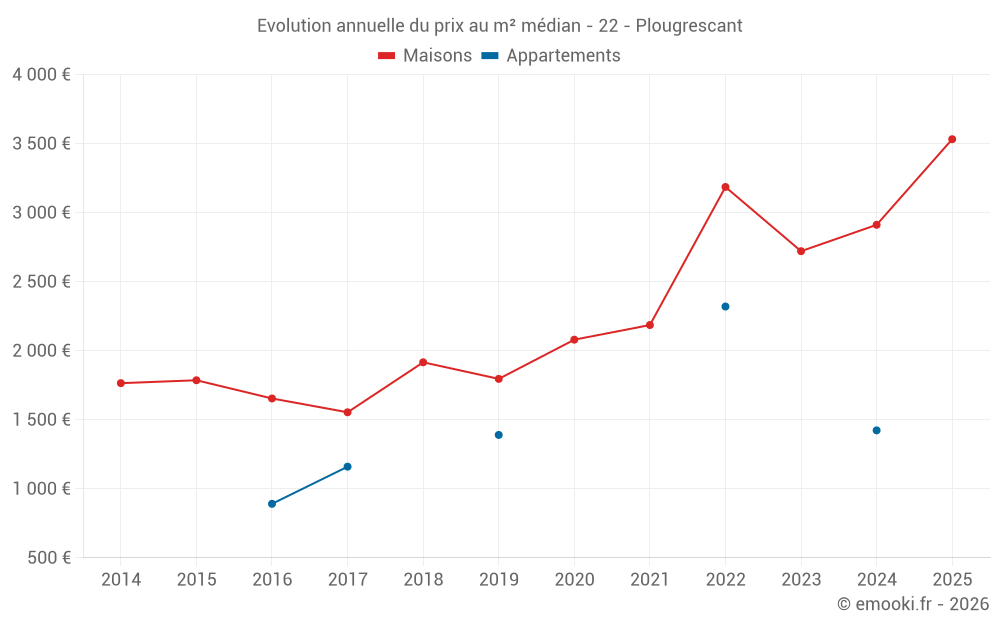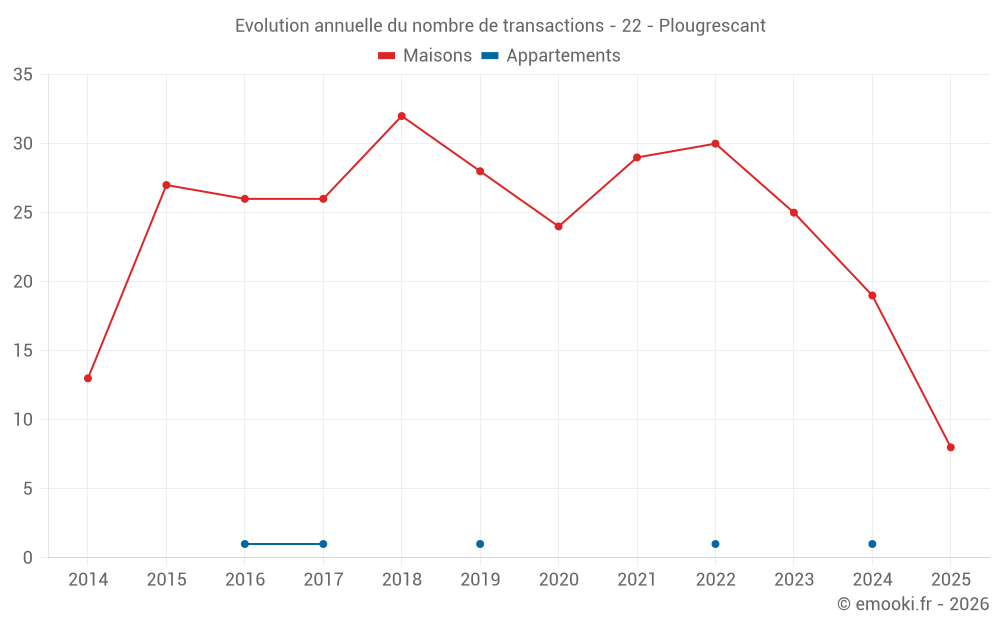 Le prix médian sur les 19 transactions de maisons des 12 derniers mois dans la commune de Plougrescant était de 3 208 € par mètre carré pour une valeur foncière médiane de 260 000 €. Sur cette période 60% des transactions se sont situées entre 1 965 et 4 689 € par mètre carré (du 2ème au 8ème déciles).
