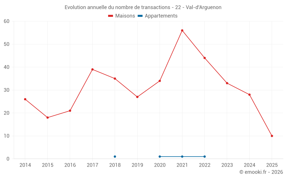 Le prix médian sur les 26 transactions de maisons des 12 derniers mois dans la commune de Val-d'Arguenon était de 1 806 € par mètre carré pour une valeur foncière médiane de 170 000 €. Sur cette période 60% des transactions se sont situées entre 1 340 et 2 361 € par mètre carré (du 2ème au 8ème déciles).
