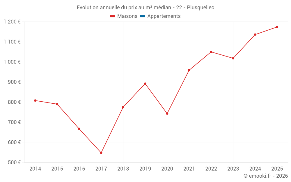 Le prix médian sur les 29 transactions de maisons des 24 derniers mois dans la commune de Plusquellec était de 1 116 € par mètre carré pour une valeur foncière médiane de 123 000 €. Sur cette période 60% des transactions se sont situées entre 823 et 1 428 € par mètre carré (du 2ème au 8ème déciles).