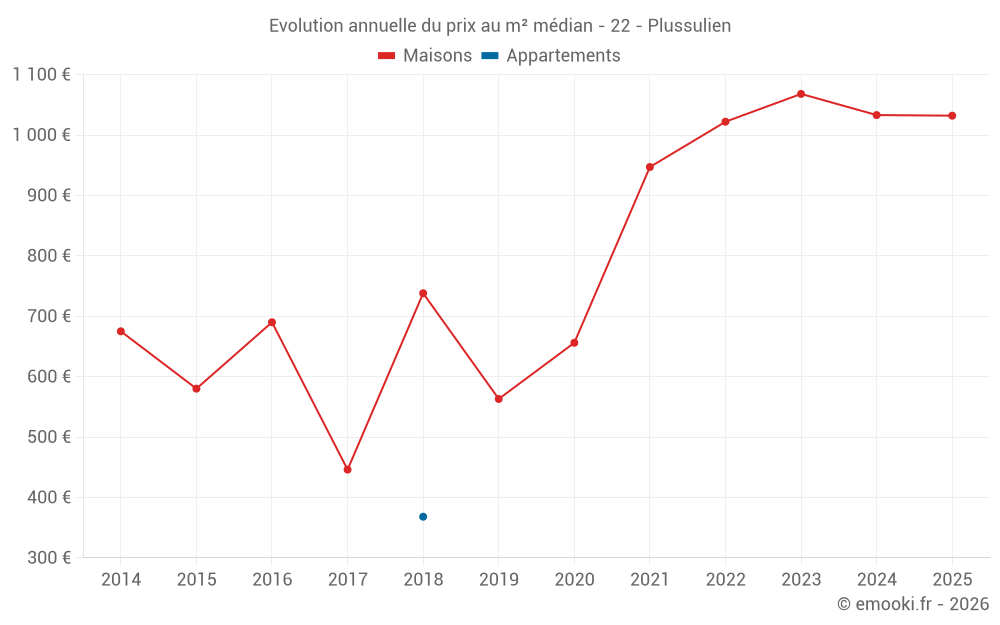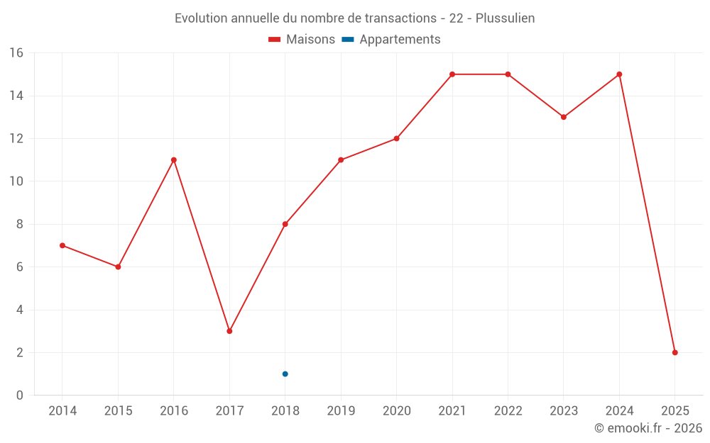 Le prix médian sur les 24 transactions de maisons des 24 derniers mois dans la commune de Plussulien était de 1 021 € par mètre carré pour une valeur foncière médiane de 93 500 €. Sur cette période 60% des transactions se sont situées entre 829 et 1 288 € par mètre carré (du 2ème au 8ème déciles).