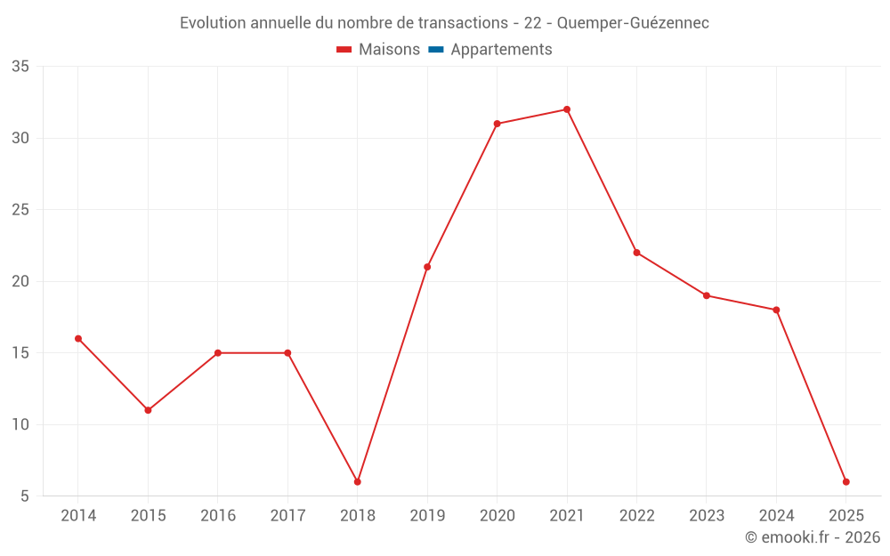 Le prix médian sur les 18 transactions de maisons des 12 derniers mois dans la commune de Quemper-Guézennec était de 1 410 € par mètre carré pour une valeur foncière médiane de 132 500 €. Sur cette période 60% des transactions se sont situées entre 866 et 1 864 € par mètre carré (du 2ème au 8ème déciles).