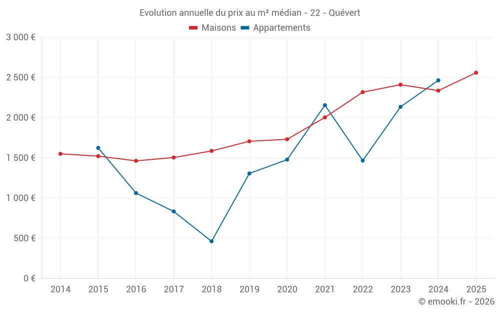 Le prix médian sur les 23 transactions de maisons des 12 derniers mois dans la commune de Quévert était de 2 559 € par mètre carré pour une valeur foncière médiane de 240 928 €. Sur cette période 60% des transactions se sont situées entre 1 426 et 2 935 € par mètre carré (du 2ème au 8ème déciles).