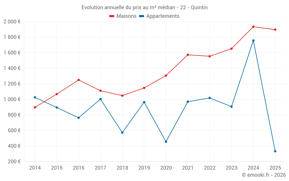 Le prix médian sur les 23 transactions de maisons des 12 derniers mois dans la commune de Quintin était de 1 867 € par mètre carré pour une valeur foncière médiane de 165 000 €. Sur cette période 60% des transactions se sont situées entre 1 569 et 2 229 € par mètre carré (du 2ème au 8ème déciles).