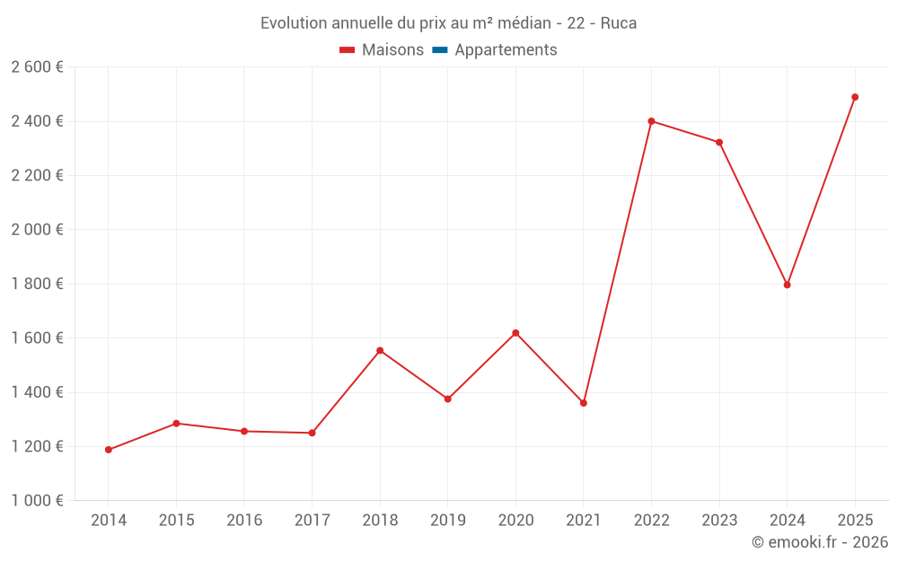 Le prix médian sur les 19 transactions de maisons des 24 derniers mois dans la commune de Ruca était de 2 064 € par mètre carré pour une valeur foncière médiane de 227 000 €. Sur cette période 60% des transactions se sont situées entre 1 655 et 2 351 € par mètre carré (du 2ème au 8ème déciles).