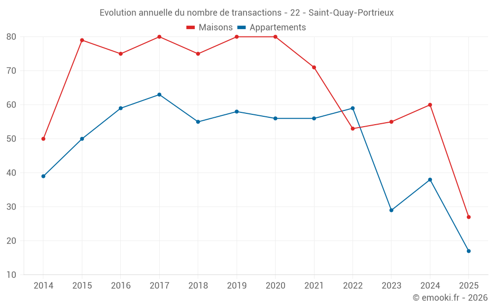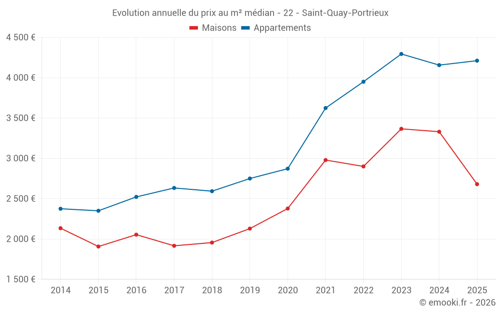 Le prix médian sur les 27 transactions de maisons des 6 derniers mois dans la commune de Saint-Quay-Portrieux était de 2 680 € par mètre carré pour une valeur foncière médiane de 305 000 €. Sur cette période 60% des transactions se sont situées entre 2 470 et 4 057 € par mètre carré (du 2ème au 8ème déciles).