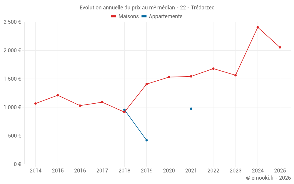 Le prix médian sur les 25 transactions de maisons des 24 derniers mois dans la commune de Trédarzec était de 2 054 € par mètre carré pour une valeur foncière médiane de 190 000 €. Sur cette période 60% des transactions se sont situées entre 1 254 et 3 064 € par mètre carré (du 2ème au 8ème déciles).