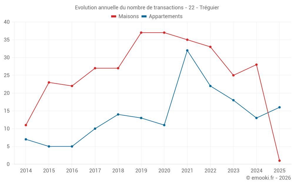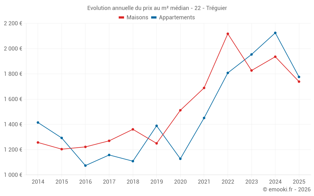 Le prix médian sur les 16 transactions de maisons des 12 derniers mois dans la commune de Tréguier était de 1 934 € par mètre carré pour une valeur foncière médiane de 185 500 €. Sur cette période 60% des transactions se sont situées entre 1 724 et 2 344 € par mètre carré (du 2ème au 8ème déciles).