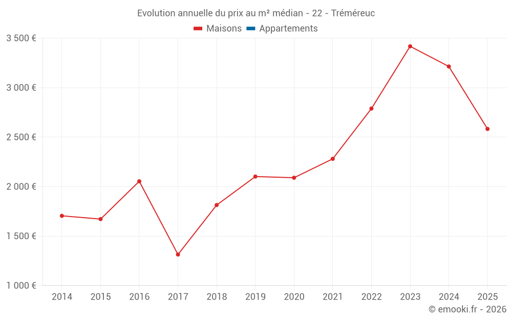 Le prix médian sur les 15 transactions de maisons des 24 derniers mois dans la commune de Tréméreuc était de 2 957 € par mètre carré pour une valeur foncière médiane de 310 000 €. Sur cette période 60% des transactions se sont situées entre 1 990 et 4 418 € par mètre carré (du 2ème au 8ème déciles).