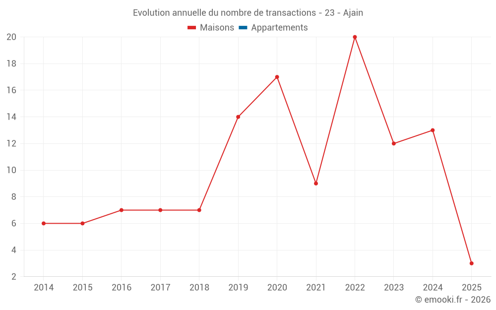 Le prix médian sur les 25 transactions de maisons des 24 derniers mois dans la commune d'Ajain était de 792 € par mètre carré pour une valeur foncière médiane de 90 000 €. Sur cette période 60% des transactions se sont situées entre 506 et 1 349 € par mètre carré (du 2ème au 8ème déciles).