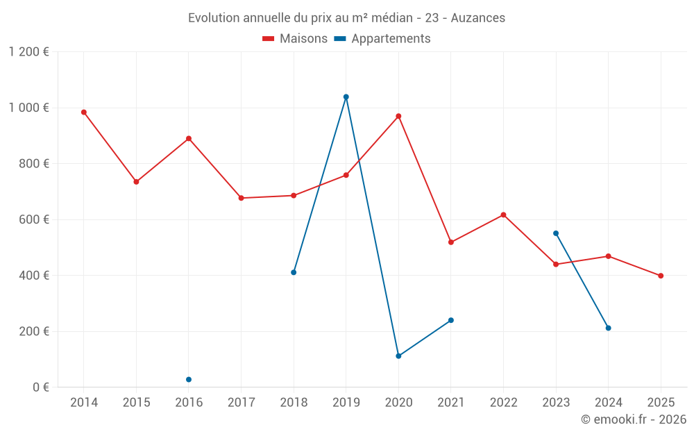 Le prix médian sur les 21 transactions de maisons des 24 derniers mois dans la commune d'Auzances était de 500 € par mètre carré pour une valeur foncière médiane de 55 000 €. Sur cette période 60% des transactions se sont situées entre 327 et 973 € par mètre carré (du 2ème au 8ème déciles).