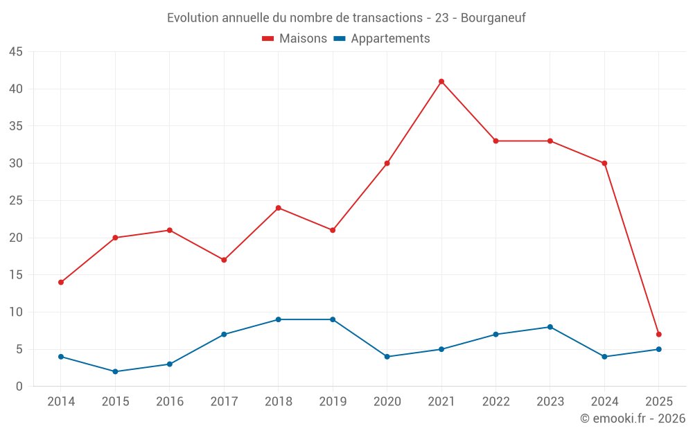 Le prix médian sur les 22 transactions de maisons des 12 derniers mois dans la commune de Bourganeuf était de 625 € par mètre carré pour une valeur foncière médiane de 48 500 €. Sur cette période 60% des transactions se sont situées entre 278 et 995 € par mètre carré (du 2ème au 8ème déciles).