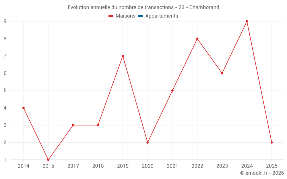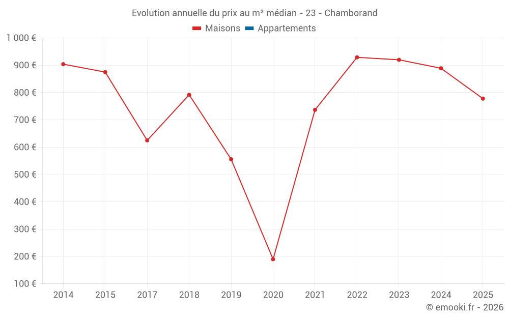 Le prix médian sur les 14 transactions de maisons des 24 derniers mois dans la commune de Chamborand était de 865 € par mètre carré pour une valeur foncière médiane de 74 500 €. Sur cette période 60% des transactions se sont situées entre 713 et 1 154 € par mètre carré (du 2ème au 8ème déciles).