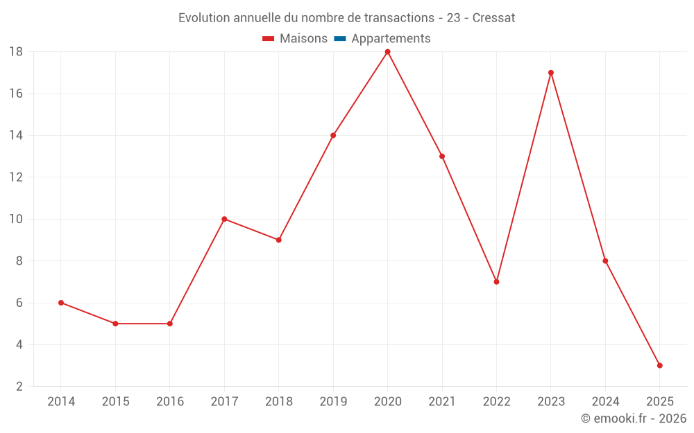 Le prix médian sur les 19 transactions de maisons des 24 derniers mois dans la commune de Cressat était de 723 € par mètre carré pour une valeur foncière médiane de 72 000 €. Sur cette période 60% des transactions se sont situées entre 295 et 1 058 € par mètre carré (du 2ème au 8ème déciles).