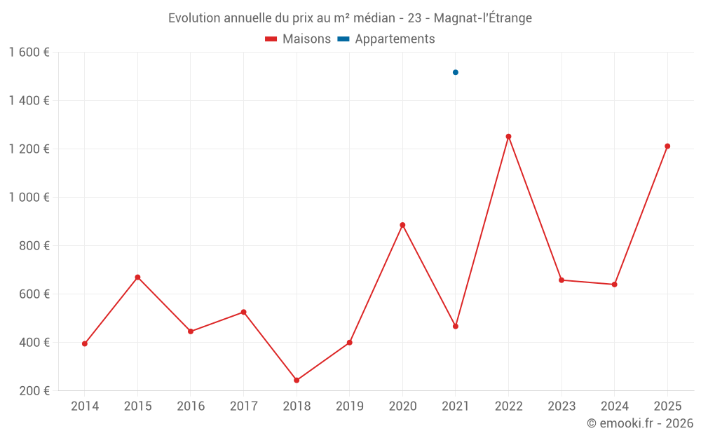 Le prix médian sur les 14 transactions de maisons des 24 derniers mois dans la commune de Magnat-l'Étrange était de 746 € par mètre carré pour une valeur foncière médiane de 48 145 €. Sur cette période 60% des transactions se sont situées entre 416 et 1 109 € par mètre carré (du 2ème au 8ème déciles).