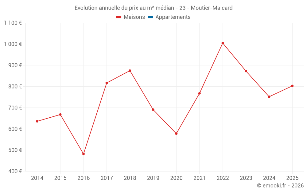 Le prix médian sur les 27 transactions de maisons des 24 derniers mois dans la commune de Moutier-Malcard était de 752 € par mètre carré pour une valeur foncière médiane de 72 000 €. Sur cette période 60% des transactions se sont situées entre 367 et 1 213 € par mètre carré (du 2ème au 8ème déciles).