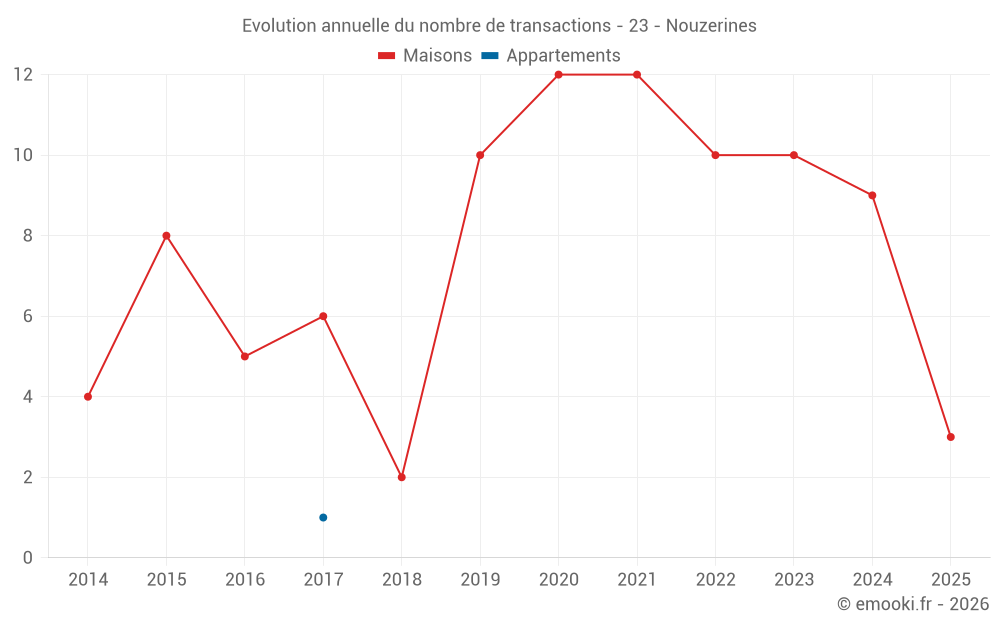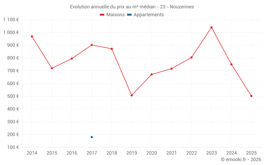 Le prix médian sur les 20 transactions de maisons des 24 derniers mois dans la commune de Nouzerines était de 857 € par mètre carré pour une valeur foncière médiane de 81 500 €. Sur cette période 60% des transactions se sont situées entre 452 et 1 303 € par mètre carré (du 2ème au 8ème déciles).