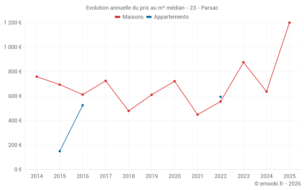 Le prix médian sur les 32 transactions de maisons des 24 derniers mois dans la commune de Parsac était de 730 € par mètre carré pour une valeur foncière médiane de 68 250 €. Sur cette période 60% des transactions se sont situées entre 395 et 1 188 € par mètre carré (du 2ème au 8ème déciles).