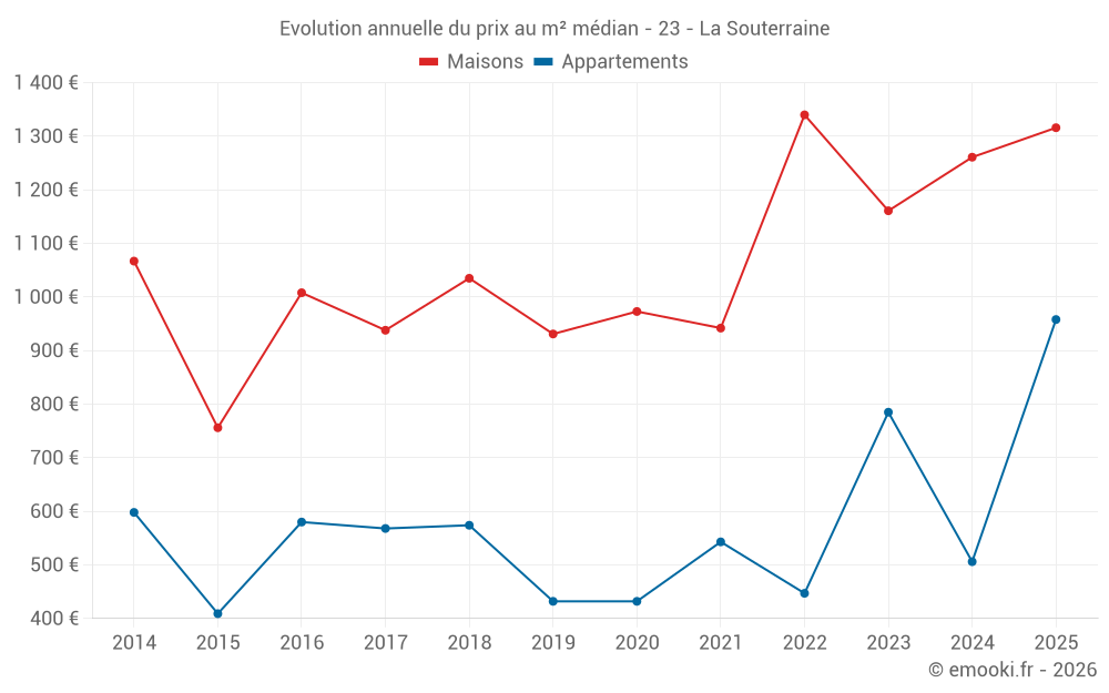 Le prix médian sur les 26 transactions de maisons des 6 derniers mois dans la commune de la Souterraine était de 1 316 € par mètre carré pour une valeur foncière médiane de 119 000 €. Sur cette période 60% des transactions se sont situées entre 907 et 1 578 € par mètre carré (du 2ème au 8ème déciles).