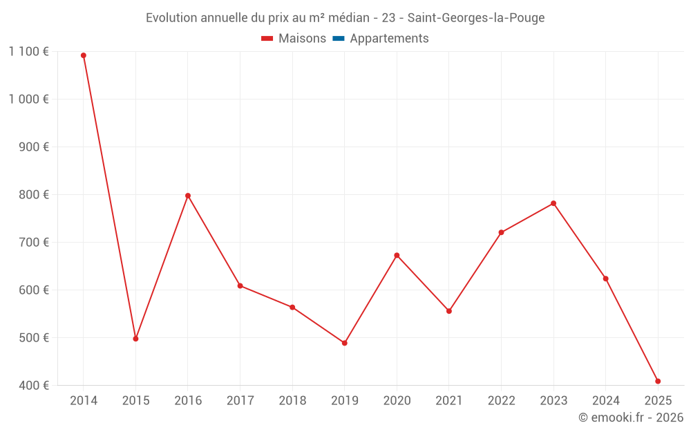 Le prix médian sur les 19 transactions de maisons des 24 derniers mois dans la commune de Saint-Georges-la-Pouge était de 673 € par mètre carré pour une valeur foncière médiane de 60 000 €. Sur cette période 60% des transactions se sont situées entre 369 et 976 € par mètre carré (du 2ème au 8ème déciles).