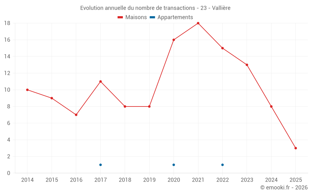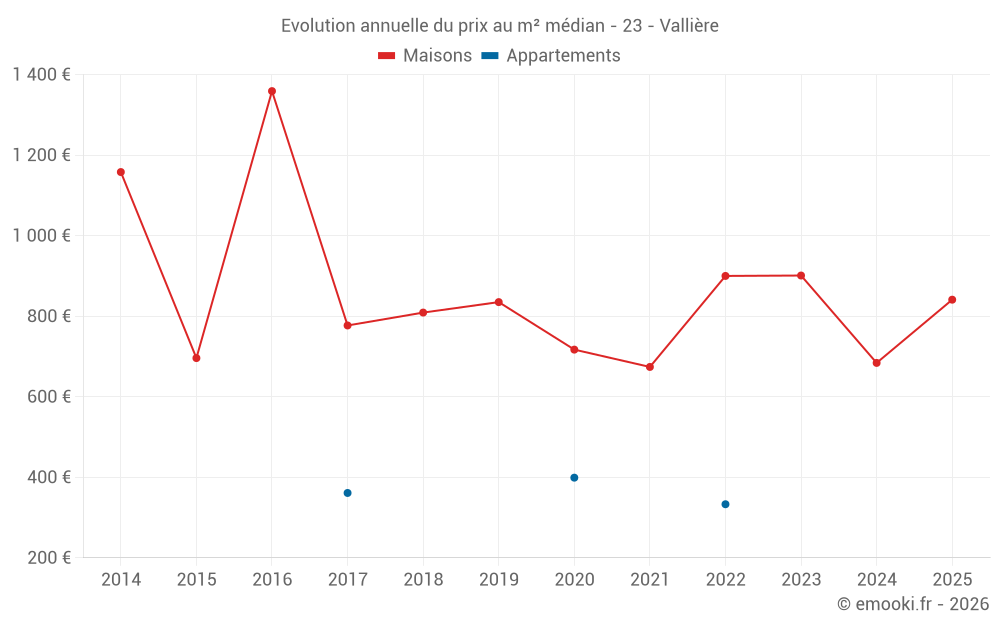 Le prix médian sur les 15 transactions de maisons des 24 derniers mois dans la commune de Vallière était de 833 € par mètre carré pour une valeur foncière médiane de 68 000 €. Sur cette période 60% des transactions se sont situées entre 604 et 1 041 € par mètre carré (du 2ème au 8ème déciles).