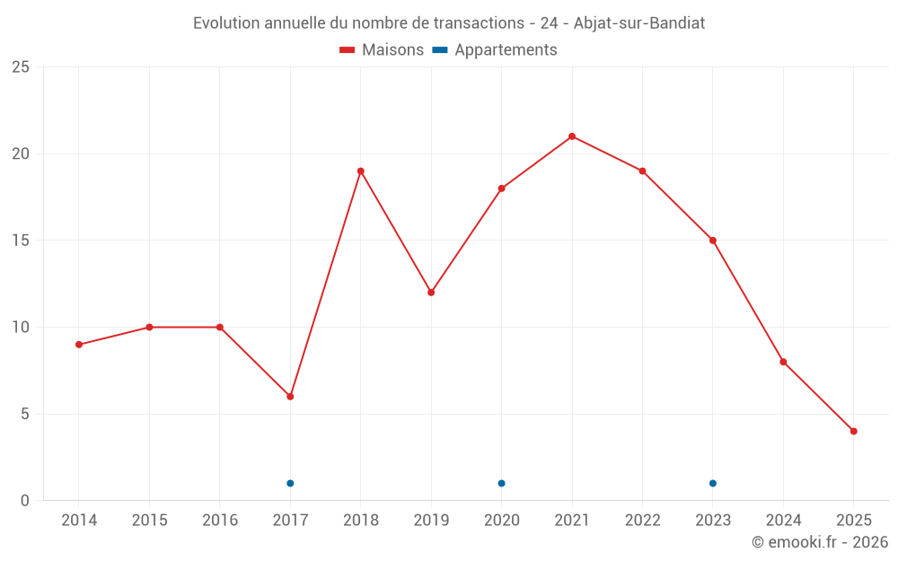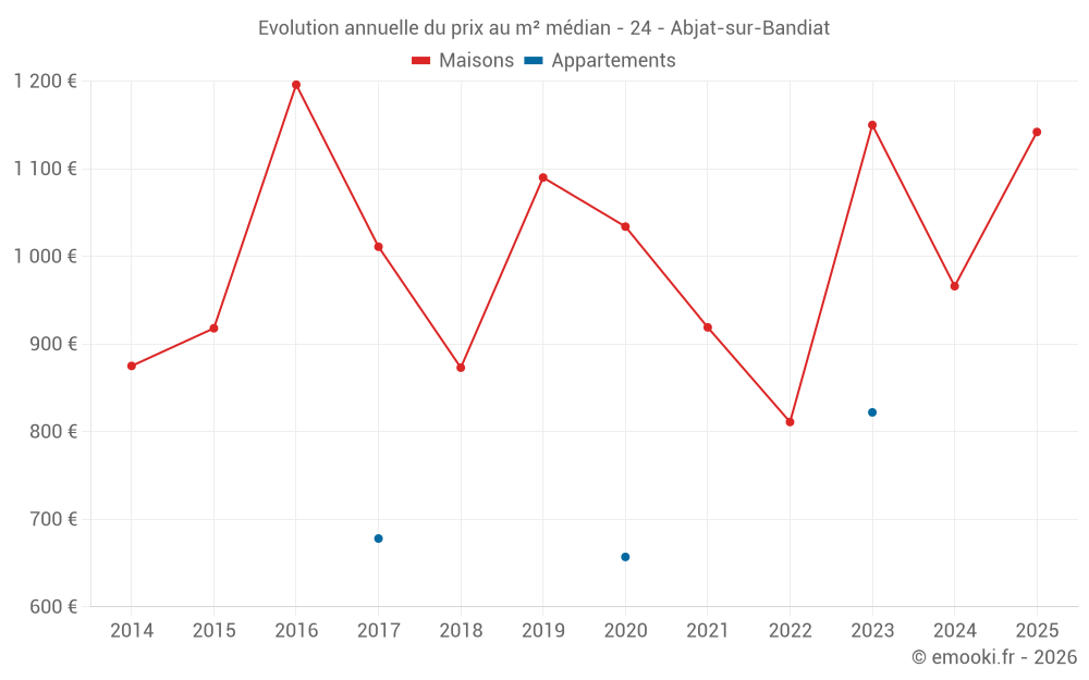 Le prix médian sur les 17 transactions de maisons des 24 derniers mois dans la commune d'Abjat-sur-Bandiat était de 893 € par mètre carré pour une valeur foncière médiane de 135 000 €. Sur cette période 60% des transactions se sont situées entre 780 et 1 723 € par mètre carré (du 2ème au 8ème déciles).