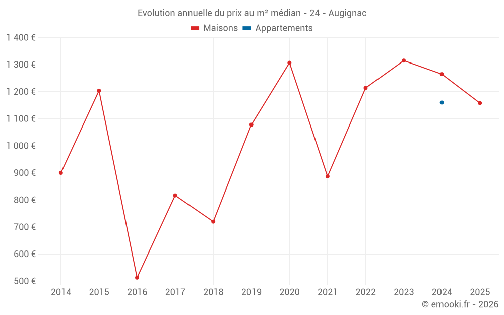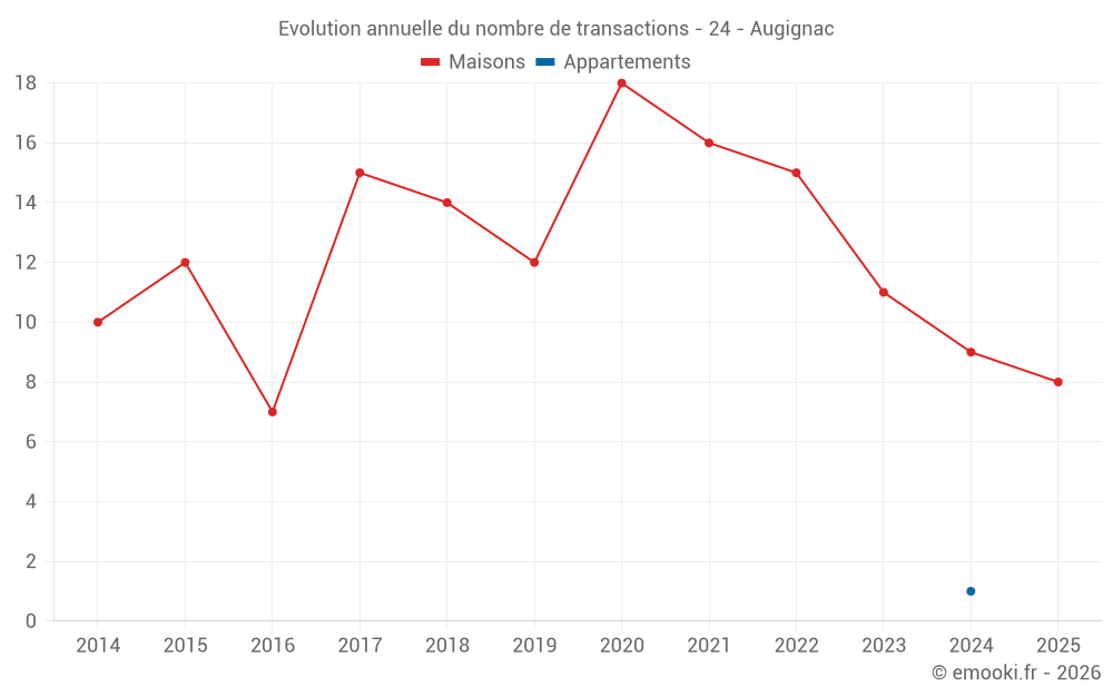 Le prix médian sur les 27 transactions de maisons des 24 derniers mois dans la commune d'Augignac était de 1 265 € par mètre carré pour une valeur foncière médiane de 151 210 €. Sur cette période 60% des transactions se sont situées entre 905 et 1 731 € par mètre carré (du 2ème au 8ème déciles).