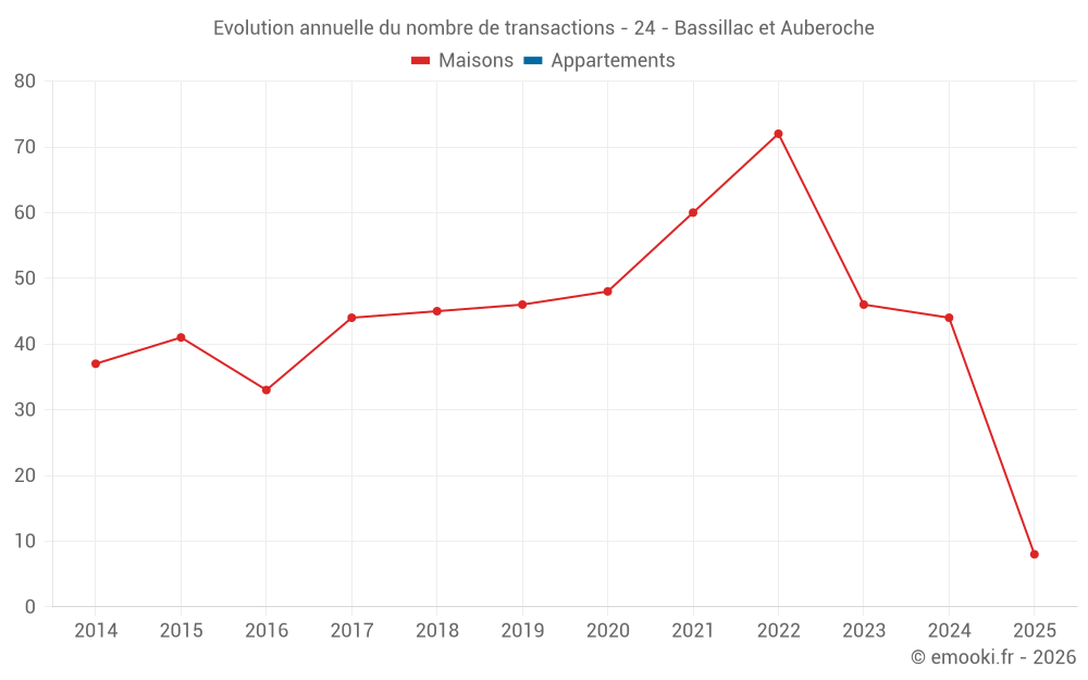 Le prix médian sur les 29 transactions de maisons des 12 derniers mois dans la commune de Bassillac et Auberoche était de 1 836 € par mètre carré pour une valeur foncière médiane de 175 000 €. Sur cette période 60% des transactions se sont situées entre 1 090 et 2 543 € par mètre carré (du 2ème au 8ème déciles).