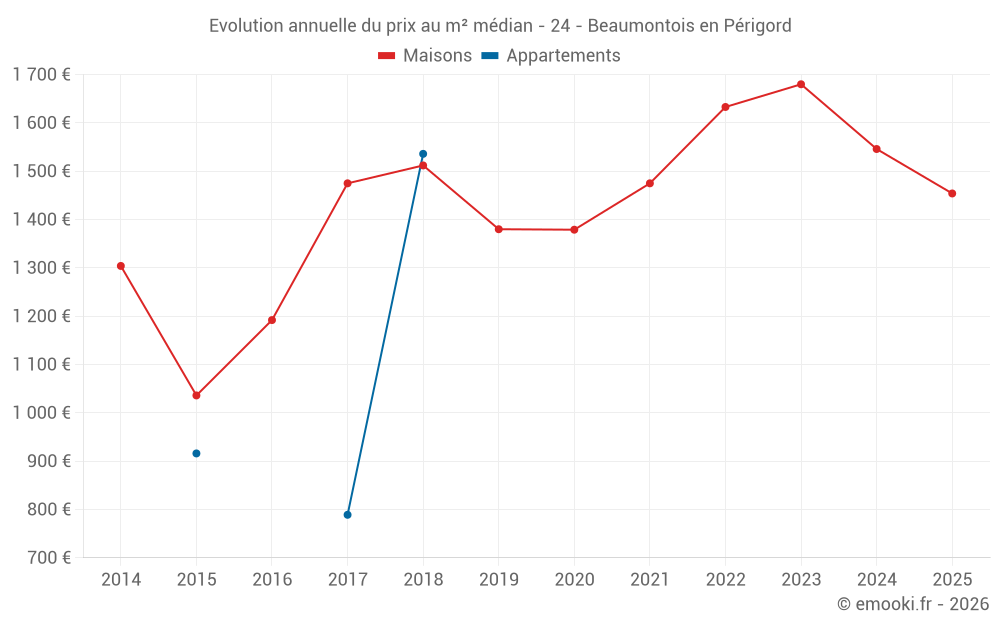 Le prix médian sur les 24 transactions de maisons des 12 derniers mois dans la commune de Beaumontois en Périgord était de 1 607 € par mètre carré pour une valeur foncière médiane de 118 500 €. Sur cette période 60% des transactions se sont situées entre 1 044 et 2 065 € par mètre carré (du 2ème au 8ème déciles).