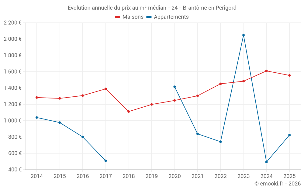 Le prix médian sur les 36 transactions de maisons des 12 derniers mois dans la commune de Brantôme en Périgord était de 1 572 € par mètre carré pour une valeur foncière médiane de 151 260 €. Sur cette période 60% des transactions se sont situées entre 1 081 et 1 923 € par mètre carré (du 2ème au 8ème déciles).