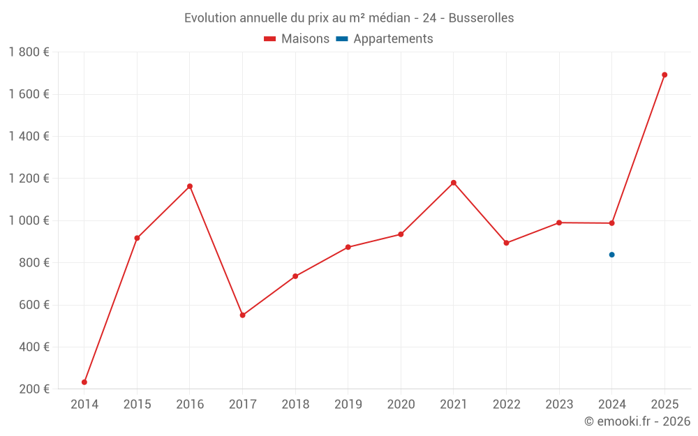 Le prix médian sur les 27 transactions de maisons des 24 derniers mois dans la commune de Busserolles était de 1 286 € par mètre carré pour une valeur foncière médiane de 86 000 €. Sur cette période 60% des transactions se sont situées entre 608 et 1 687 € par mètre carré (du 2ème au 8ème déciles).