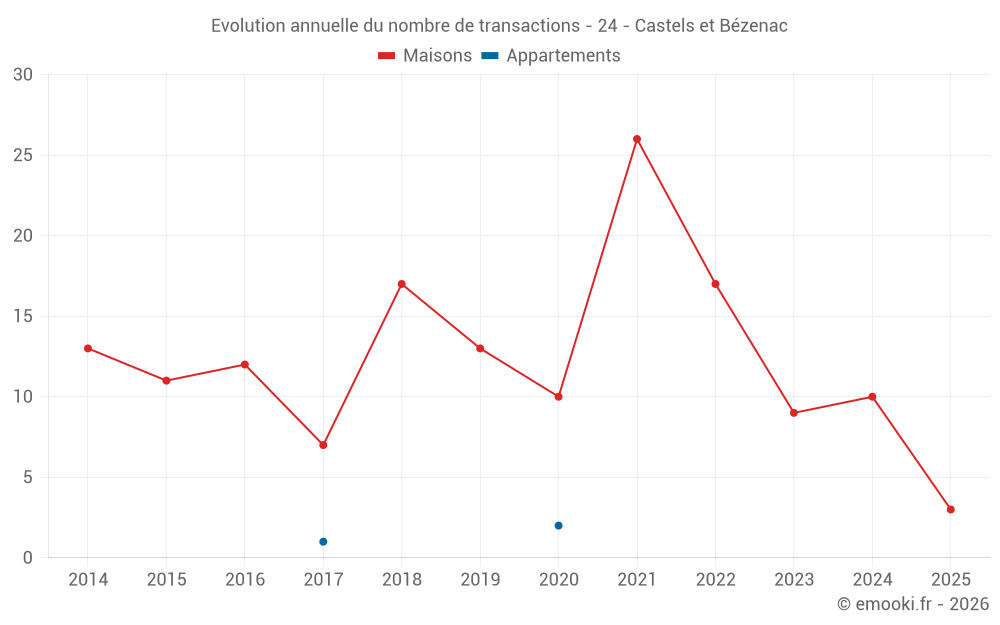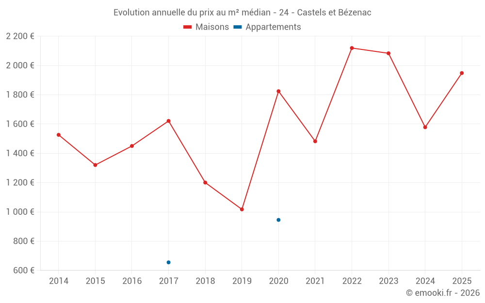 Le prix médian sur les 18 transactions de maisons des 24 derniers mois dans la commune de Castels et Bézenac était de 1 948 € par mètre carré pour une valeur foncière médiane de 172 500 €. Sur cette période 60% des transactions se sont situées entre 1 302 et 2 613 € par mètre carré (du 2ème au 8ème déciles).