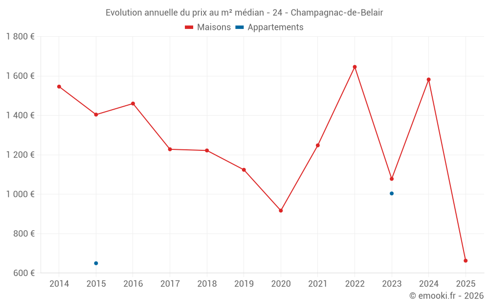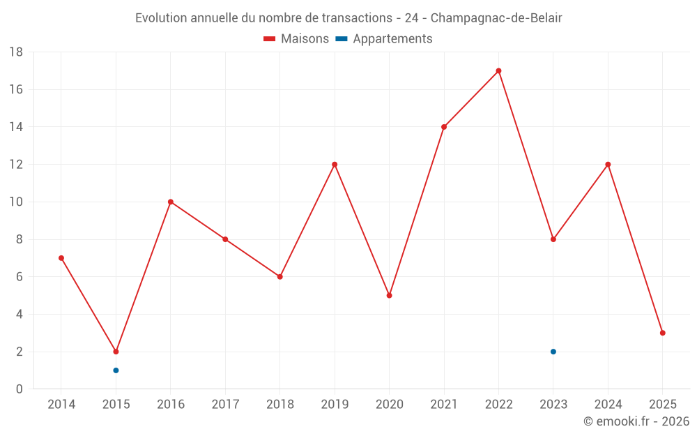 Le prix médian sur les 19 transactions de maisons des 24 derniers mois dans la commune de Champagnac-de-Belair était de 1 193 € par mètre carré pour une valeur foncière médiane de 124 070 €. Sur cette période 60% des transactions se sont situées entre 760 et 1 732 € par mètre carré (du 2ème au 8ème déciles).