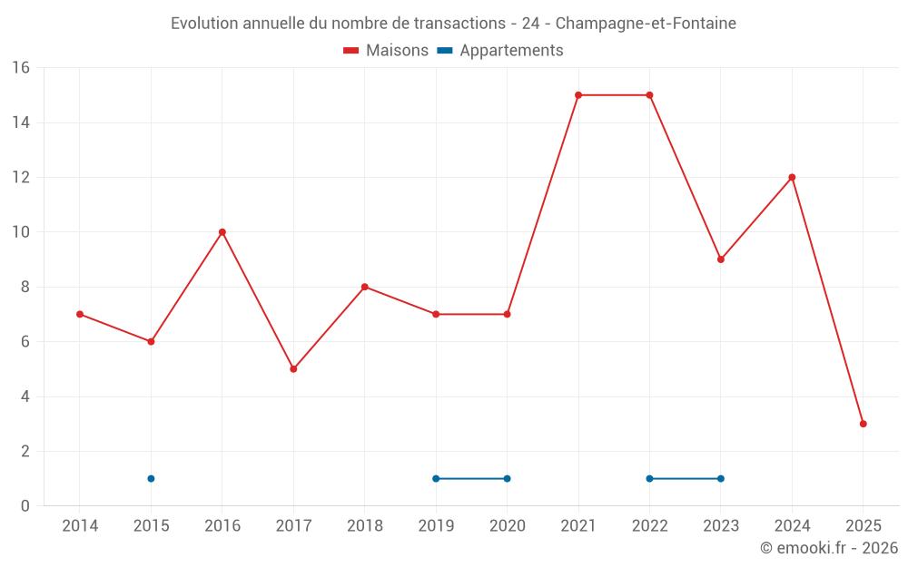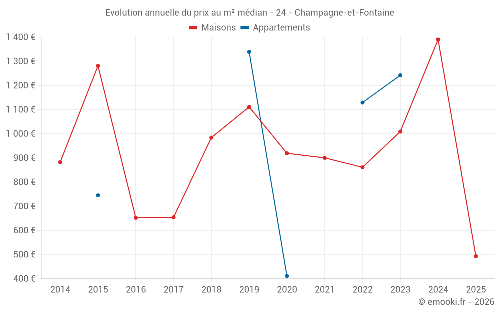 Le prix médian sur les 18 transactions de maisons des 24 derniers mois dans la commune de Champagne-et-Fontaine était de 1 218 € par mètre carré pour une valeur foncière médiane de 156 735 €. Sur cette période 60% des transactions se sont situées entre 737 et 2 000 € par mètre carré (du 2ème au 8ème déciles).