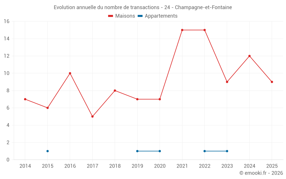 Le prix médian sur les 21 transactions de maisons des 24 derniers mois dans la commune de Champagne-et-Fontaine était de 1 253 € par mètre carré pour une valeur foncière médiane de 170 000 €. Sur cette période 60% des transactions se sont situées entre 960 et 2 143 € par mètre carré (du 2ème au 8ème déciles).