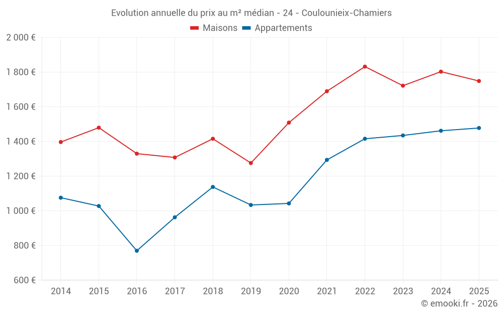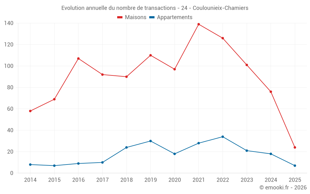Le prix médian sur les 24 transactions de maisons des 6 derniers mois dans la commune de Coulounieix-Chamiers était de 1 749 € par mètre carré pour une valeur foncière médiane de 150 000 €. Sur cette période 60% des transactions se sont situées entre 1 519 et 2 159 € par mètre carré (du 2ème au 8ème déciles).