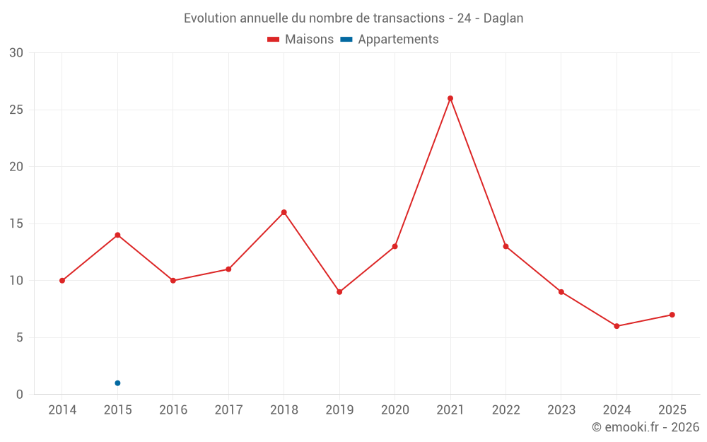 Le prix médian sur les 18 transactions de maisons des 24 derniers mois dans la commune de Daglan était de 1 580 € par mètre carré pour une valeur foncière médiane de 182 500 €. Sur cette période 60% des transactions se sont situées entre 1 219 et 2 895 € par mètre carré (du 2ème au 8ème déciles).