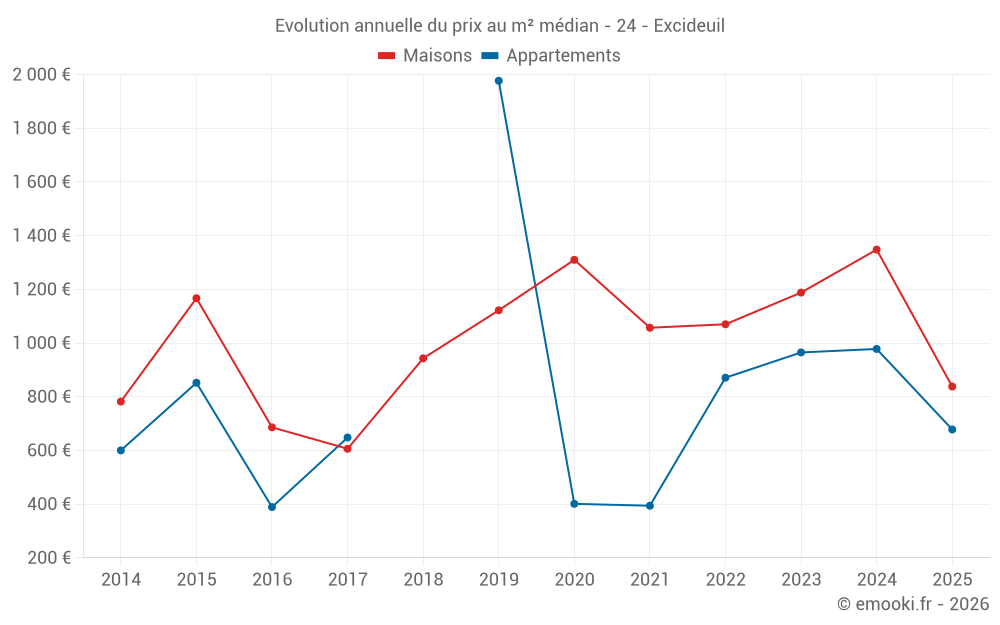 Le prix médian sur les 32 transactions de maisons des 24 derniers mois dans la commune d'Excideuil était de 1 283 € par mètre carré pour une valeur foncière médiane de 105 725 €. Sur cette période 60% des transactions se sont situées entre 575 et 1 646 € par mètre carré (du 2ème au 8ème déciles).