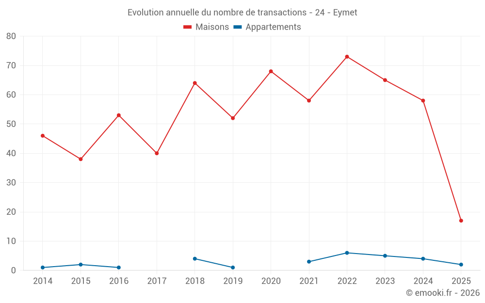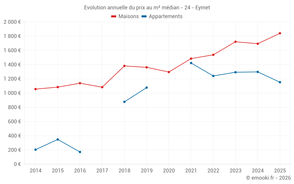 Le prix médian sur les 48 transactions de maisons des 12 derniers mois dans la commune d'Eymet était de 1 877 € par mètre carré pour une valeur foncière médiane de 206 378 €. Sur cette période 60% des transactions se sont situées entre 1 267 et 2 479 € par mètre carré (du 2ème au 8ème déciles).