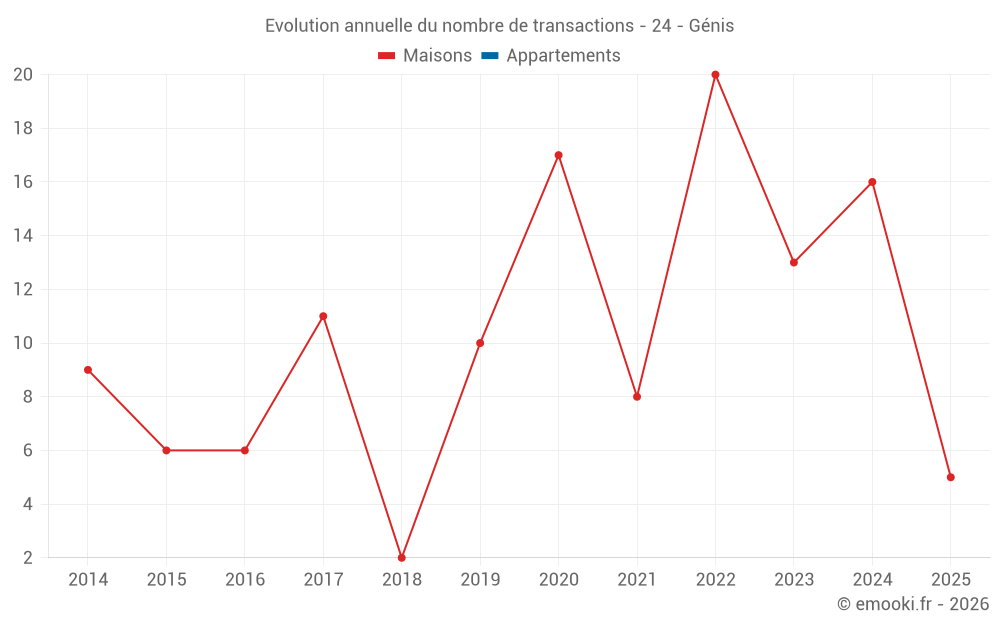 Le prix médian sur les 28 transactions de maisons des 24 derniers mois dans la commune de Génis était de 1 066 € par mètre carré pour une valeur foncière médiane de 107 992 €. Sur cette période 60% des transactions se sont situées entre 676 et 1 665 € par mètre carré (du 2ème au 8ème déciles).